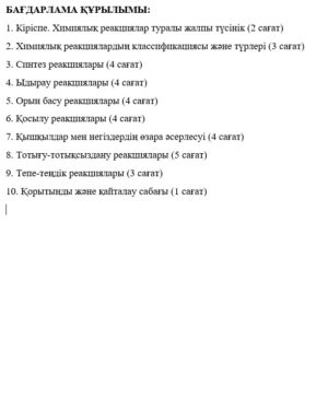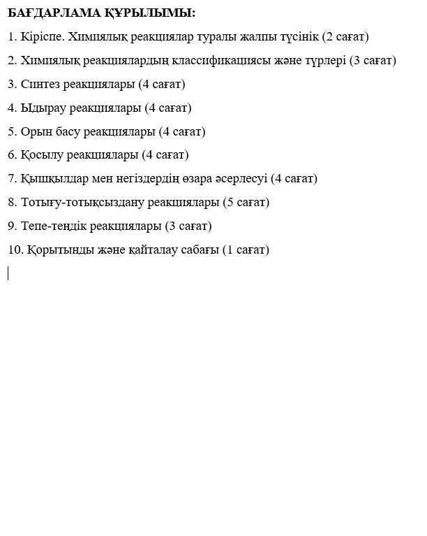 Химиялық реакциялар типтері :10 сынып оқушыларына арналған авторлық бағдарлама /құраст. Г.Кадишова, Р.Жуманова. – Шымкент, 2024. –72 б.