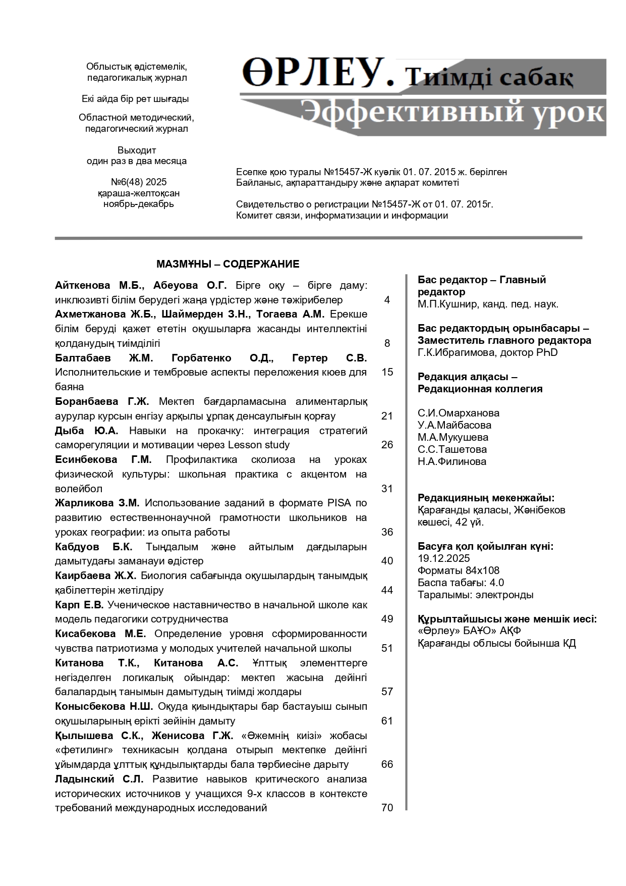 «ӨРЛЕУ. ТИІМДІ САБАҚ – ӨРЛЕУ. ЭФФЕКТИВНЫЙ УРОК» №6(48) 2025